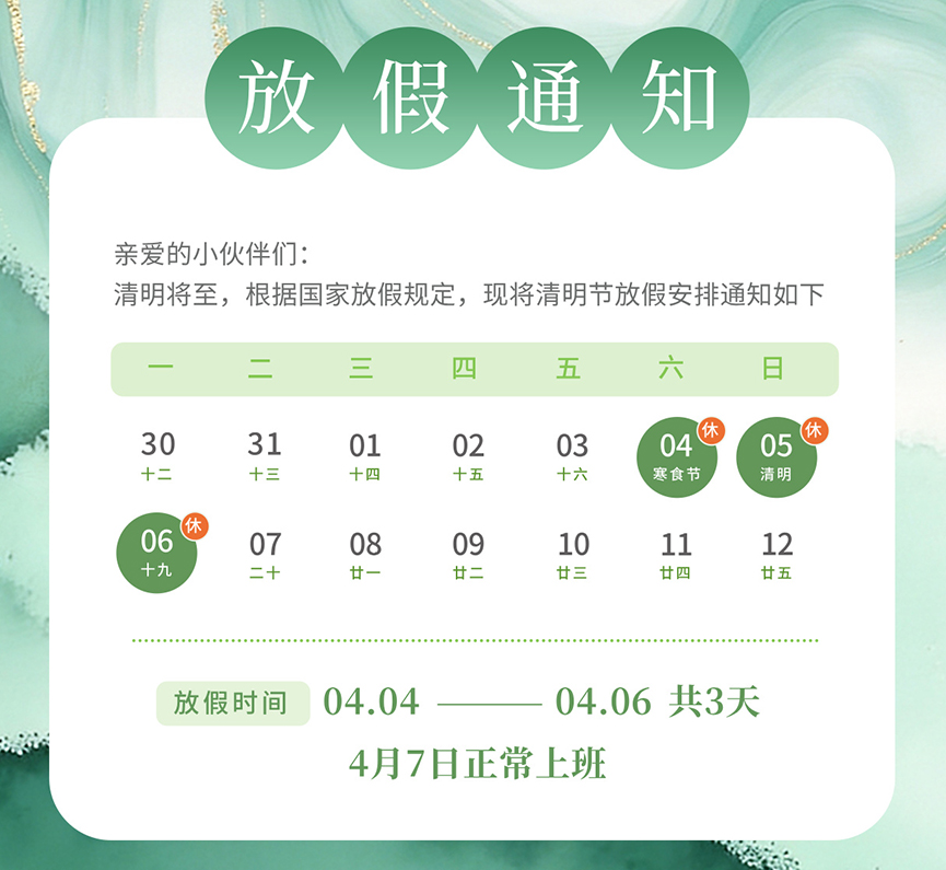2026年4月4日(星期六)至4月6日(星期一)放假,共3天;4月7日(星期二)起正常上班。